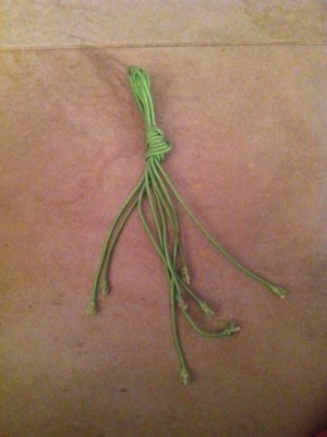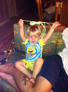 I really have to give this one up for my husband’s quick and creative thinking. As we arrived in Key West this week – with minimal toys on hand – we realized that the 2 year old was not really satisfied with his selection. As Dear Hubby (DH) untied the double stroller from the roof rack, he knotted the 4 short pieces of rope into one big knot and called it “Octopus”, and BAM! A new friend was made.