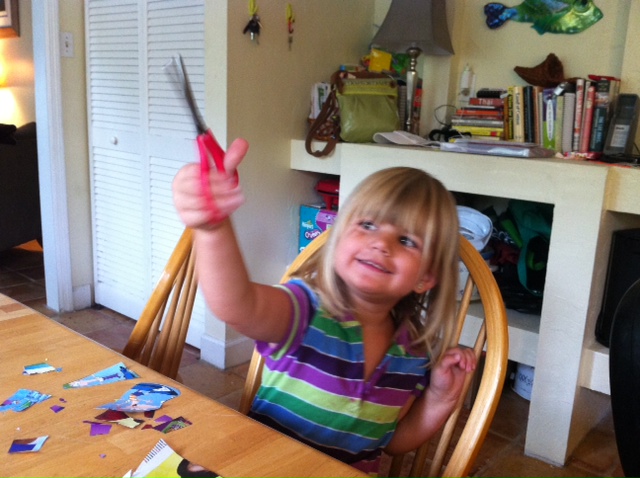 The first thing that we had to do is go buy some safety scissors. That was the highlight of a rainy morning as it was one of the only times we got out of the house. I asked each of the kids what they wanted to cut out, numbers, letters, etc. I picked anything that had cars, dinosaurs, or any of the old Elmo-standards. Nobody really cared about what was being cut, as long as there was cutting. So, after 20 minutes of me handing them pages with things they might want to cut, they just cut it all up.