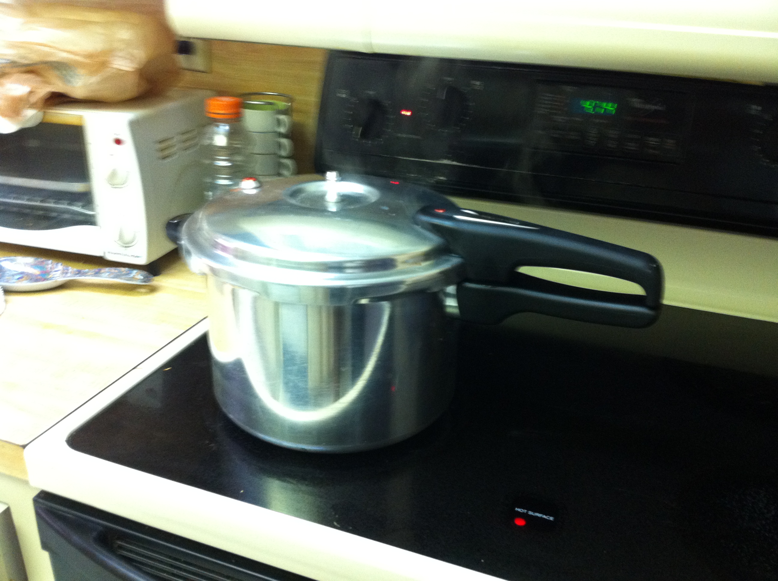 He was able to produce a pressure cooker – which I have to admit in my 39 years I had never used. So I decided to transfer the soup and fire that baby up.