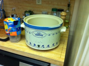 After letting them cook on high for 3 1/2 hours they were still — um — stones. Rock solid, no swelling, no sweating, no peeling. Just angry green rocks staring back at me. Fine — I’ve got at least another hour. So, I packed up the crock pot in my car and drove down to the beach. When I knocked on the BFF’s door carrying a crock pot in a blue plastic storage bin with my purse and grocery bags on one arm, and the ladle that had gone rogue in the car during the thunderstorm under the other, and it all other ways a hot mess, all he could say was, “you know it hurts when I laugh.”