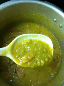 I let the pressure cooker go for about 30 minutes until I was sure that everything but the peas had been pulverized – and I was right. What I hadn’t counted on, however, was the fact that now the bottom 2 inches of pan had become solid roasted pea brittle only to be loosened with battle armor. I had to convince myself not to cry – well, in public anyway.