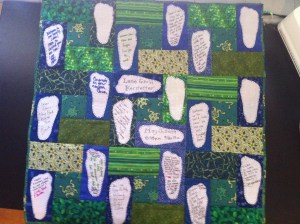 I made signature quilts for each of the kids when they were born. All of the doctors, nurses, and everyone who came to visit in the hospital or the day we got home signed them for each of the kids. I just finished Lane’s…um yeah, he’s 2 – he’ll never know it took me a while to finish the back (don’t tell!) I actually used Matilda’s foot at a template for the signature plates. I thought it would be a nice touch.