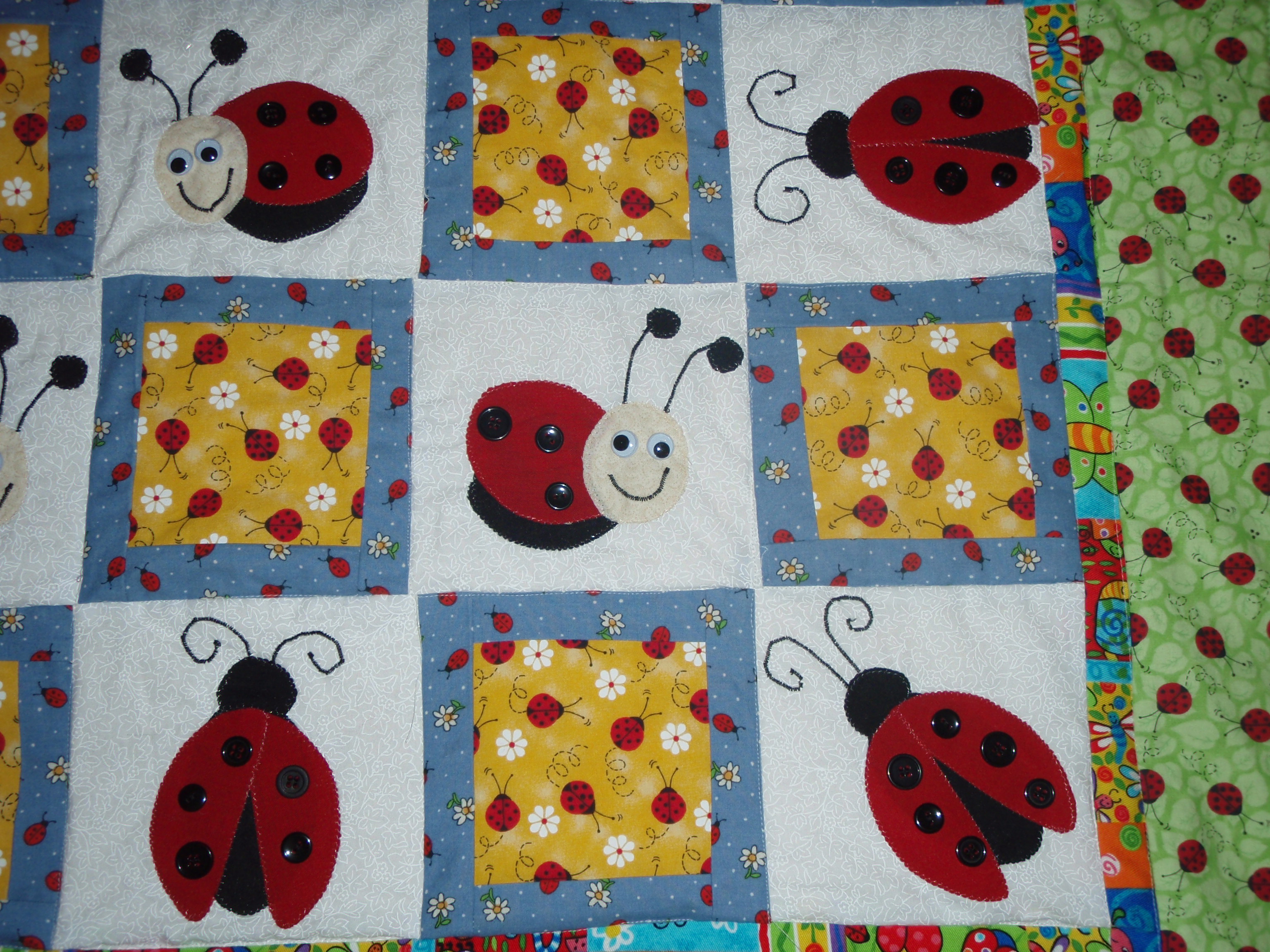 I’ve made several for Matilda, but I think my favorite one is the Ladybug quilt. This was my first quilt with no real pattern, and I had to find the designs for the appliques online and kinda fudge them myself. Each ladybug has buttons for dots, and each one is different so we could practice counting.