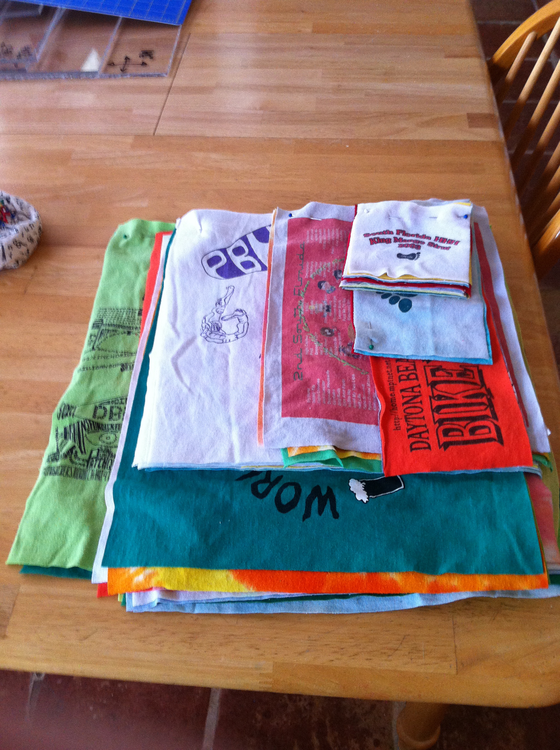 Clothes. Ok, mainly t-shirts. It’s a well known fact that in addition to being an admitted dork in possessing all of the aforementioned books, I’m also a quilter. So this year I decided to work on new type of quilt — a t-shirt quilt. I gathered up more than a decades worth of Hash House Harriers t-shirts from all the assorted runs and laid them out to cut up…..it was harder than you can imagine. Quite honestly, I felt like I was breaking up with these t-shirts. Even though I hadn’t warn many of them in years, it was painful. In fact, the very first shirt I ever owned that listed my hash name on it (Hurricane Hashes of 1999) it took me several days before I could slice it. And in the quilt, I’m saving the part with the logo and my name! But I can no longer slip that puppy on and take it out for a spin. Goodbye, old friend.