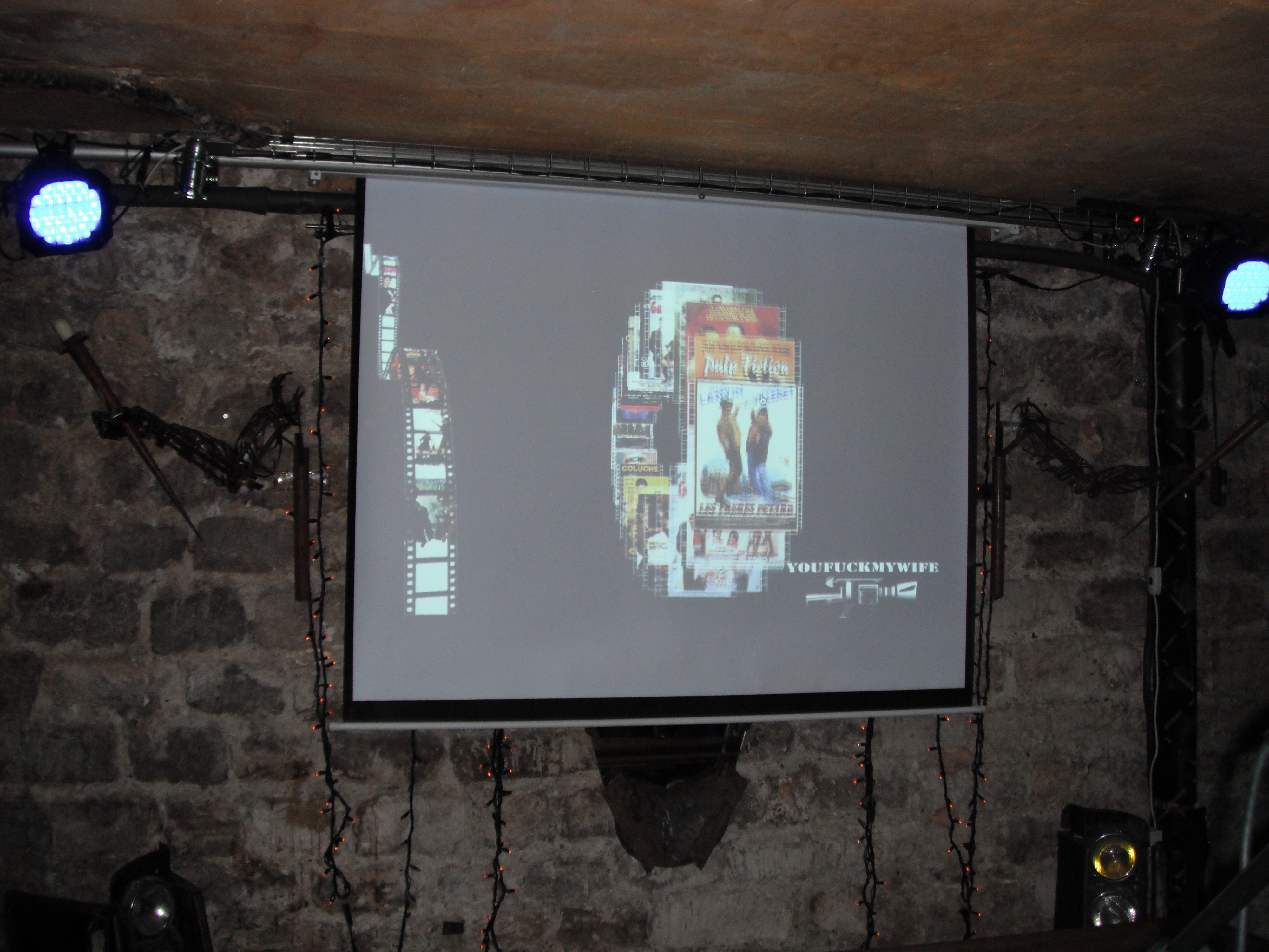 They played movie scenes, and had the lines up on the screen and the “actors” recited them. It was actually pretty funny at first….and then we found out what the feature attraction was going to be that night: You Fuck My Wife. Really, I couldn’t make that up.