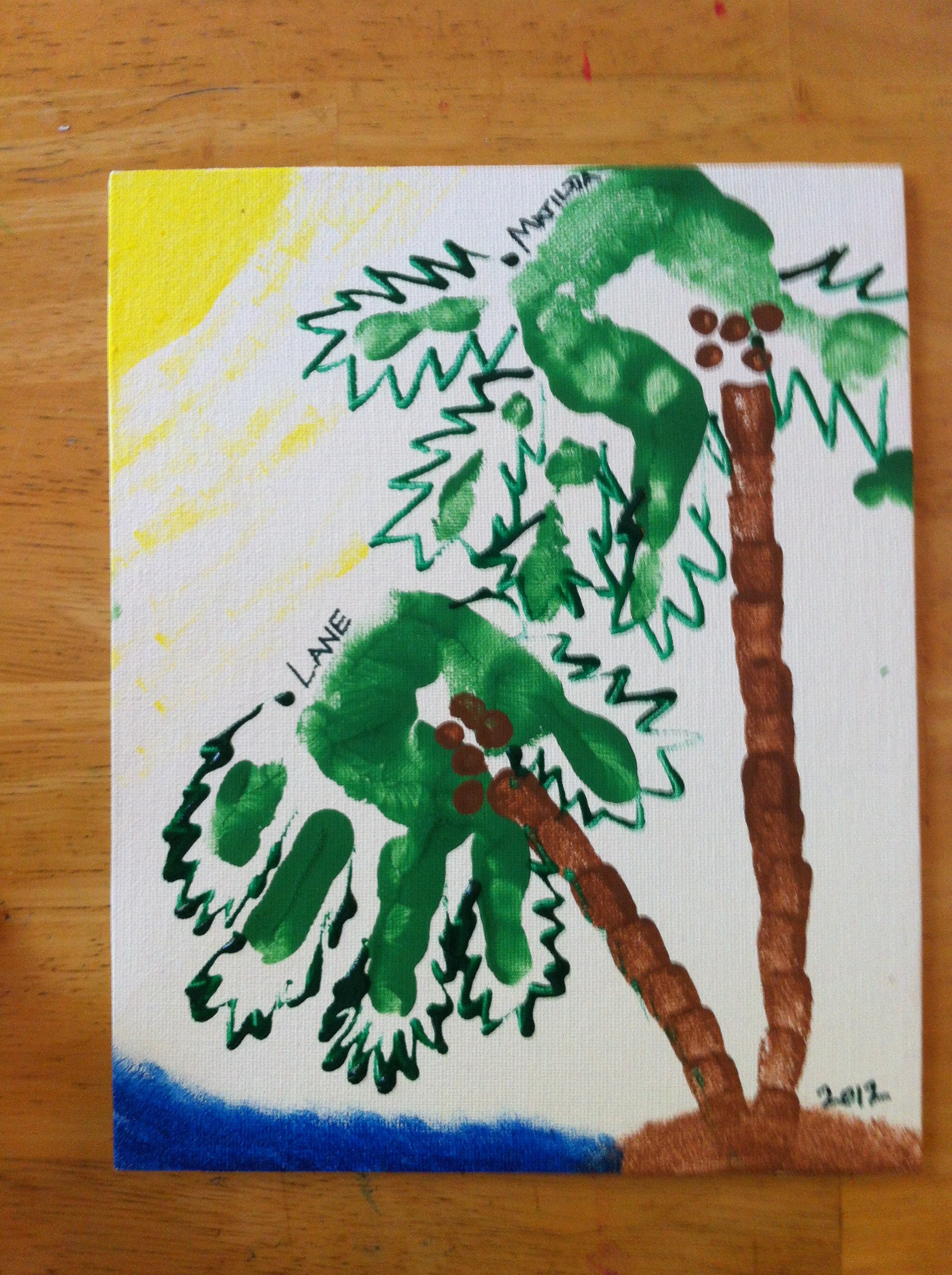 I got so excited The kids got so excited doing the handprints, that we decided to make one for Grandad, too. He lives in Baltimore and doesn’t get to see the kids too often, so I figured a little handmade gift would be nice. I had each of the kids do one palm print, and I turned them into trees. Adding the island and the sun really gave this one context, so it looked a little less like a Rorschach test.