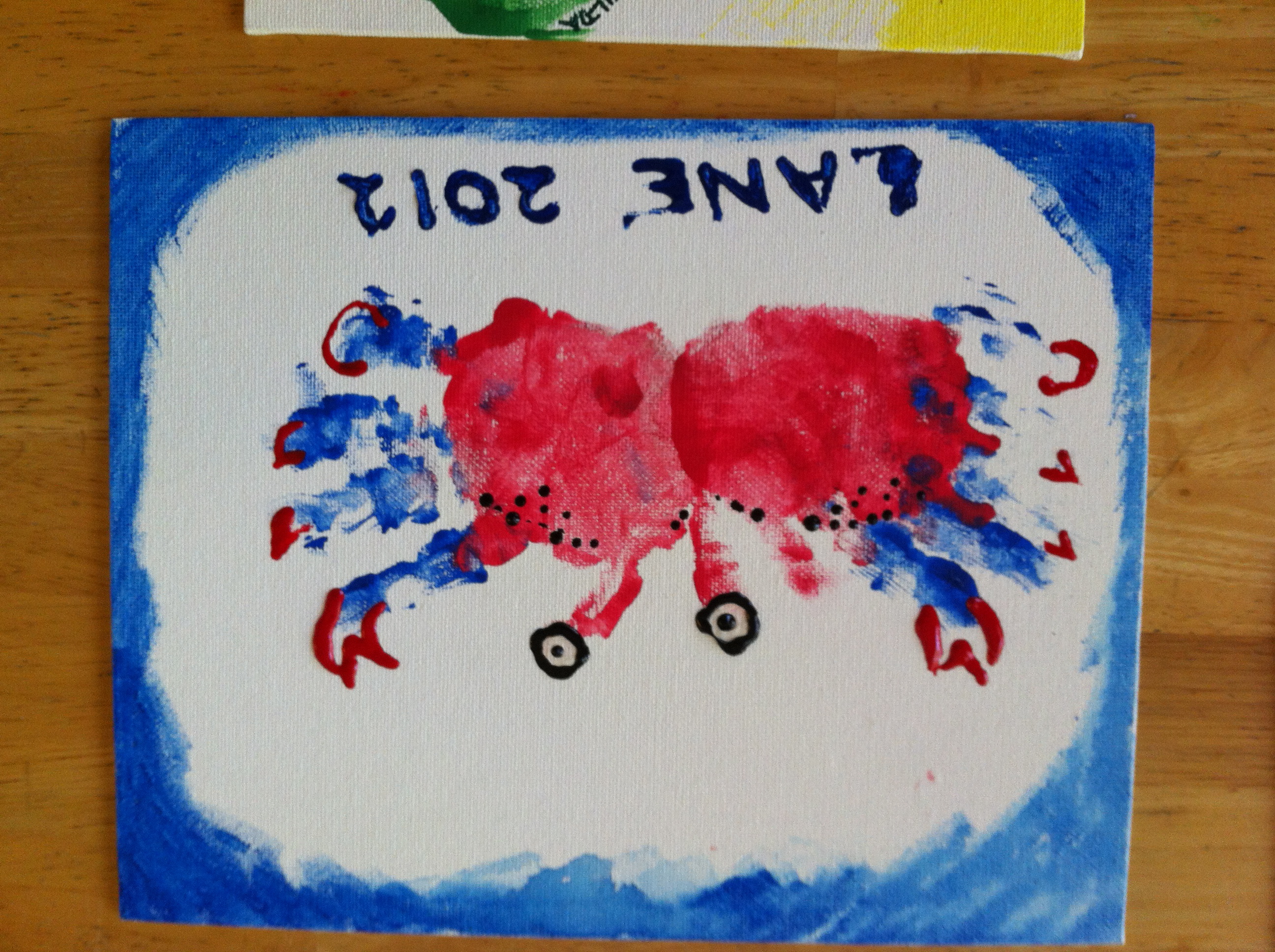 This was Lane’s choice. He was really patient and enjoyed having his hands painted in 2 colors (red on the palms, and blue on the fingers). One of the palm prints got a little smushed, but hey, he’s 3 and I think he did pretty darned good. I put the embellishments on with fabric paint pens. They weren’t very accurate, and I kept getting a lot of bubbles, but this was the first one. We think Daddy, the Marine Scientist, will really like this one too.