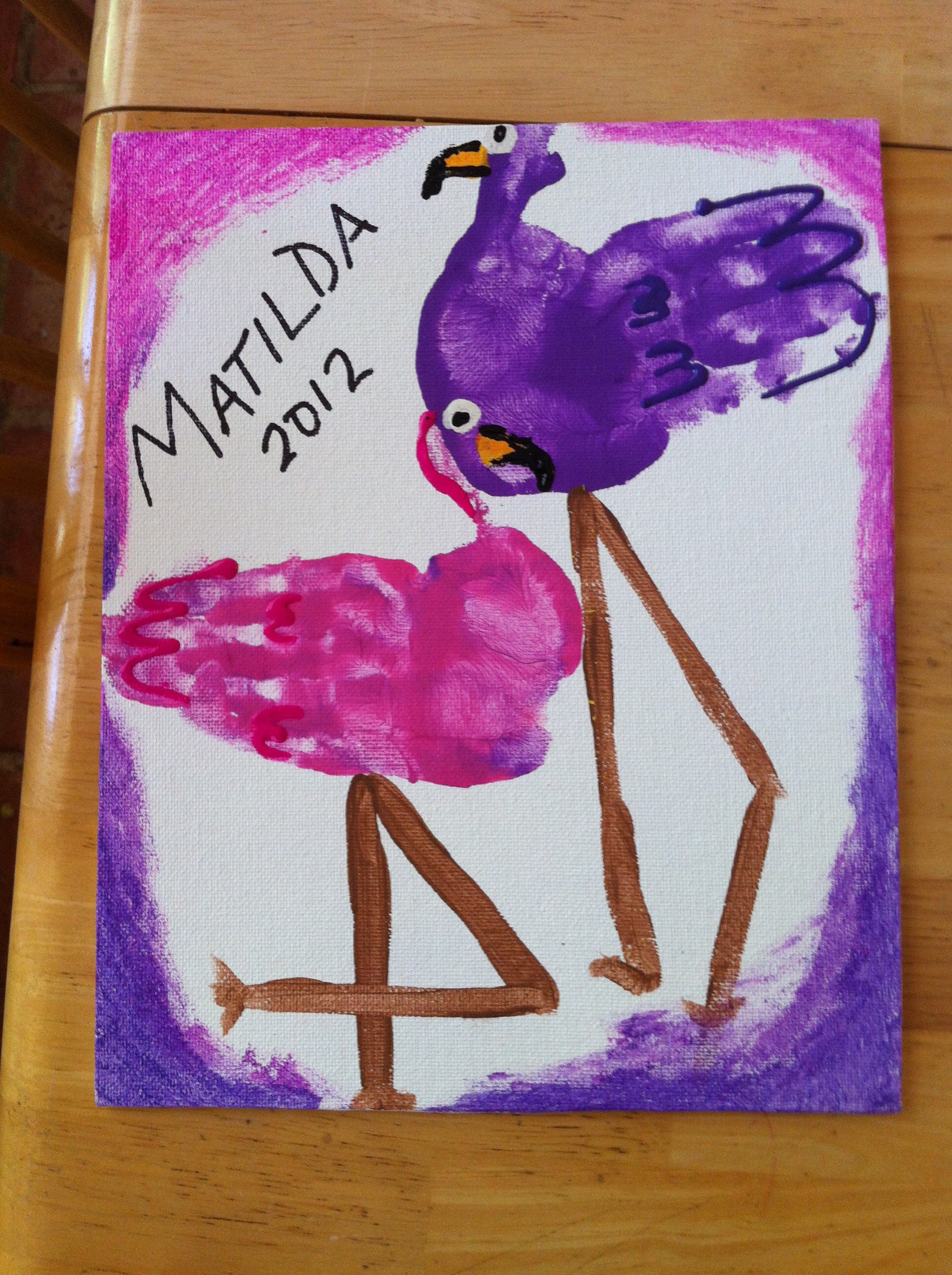 Matilda insisted on flamingos (my animal choices were kind of limited to what I found in a book I had, but it was good for her). She also insisted that flamingos, in fact, were going to by PURPLE. We compromised with one pink and one purple flamingo. Again, I did the embellishments on the wings, the eyes and beaks with the paint pens. These were a little better. I just used a Sharpie to put her name.