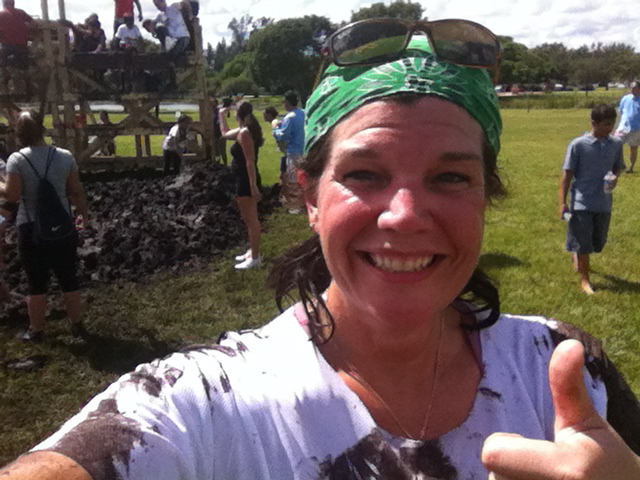 At this point, I enjoyed laughing at all the misspellings and had a bit of a straight away to run for awhile without obstacles. The money shots were all at the end: scale walls and jump into giant piles of mud, and an open water 50-yard mud pit whee you were sprayed with water hoses as you had to climb over the mud piles to escape. Several people lost shoes. Just for shits and giggles we each performed some muddy belly flops – hey, I didn’t have a friggin’ safety pin for my bib, I was going to get my money’s worth of mud. And in most spectacular fashion, they were playing — and I was singing — “What Makes You Beautiful” as I danced across the finish line.
