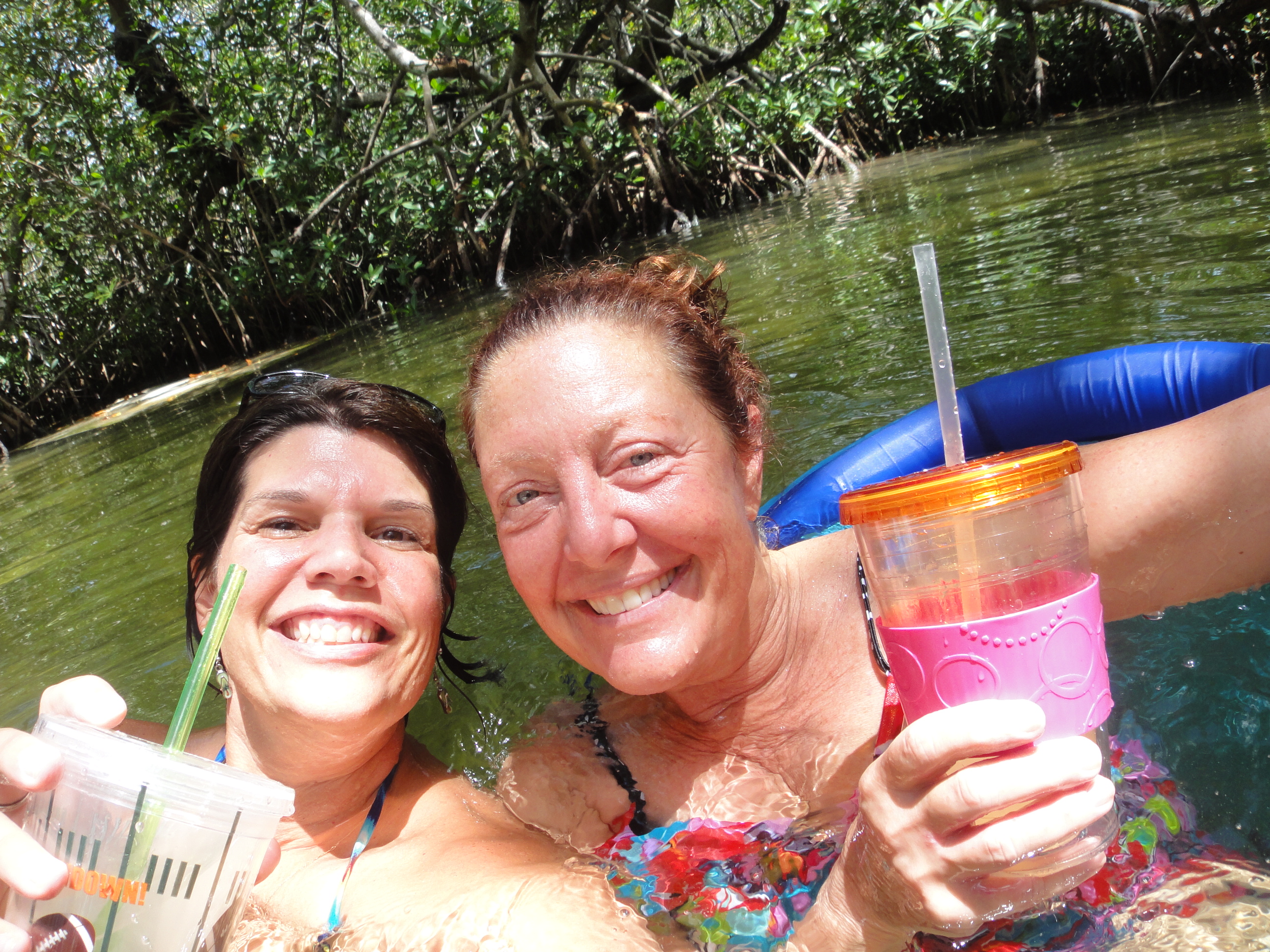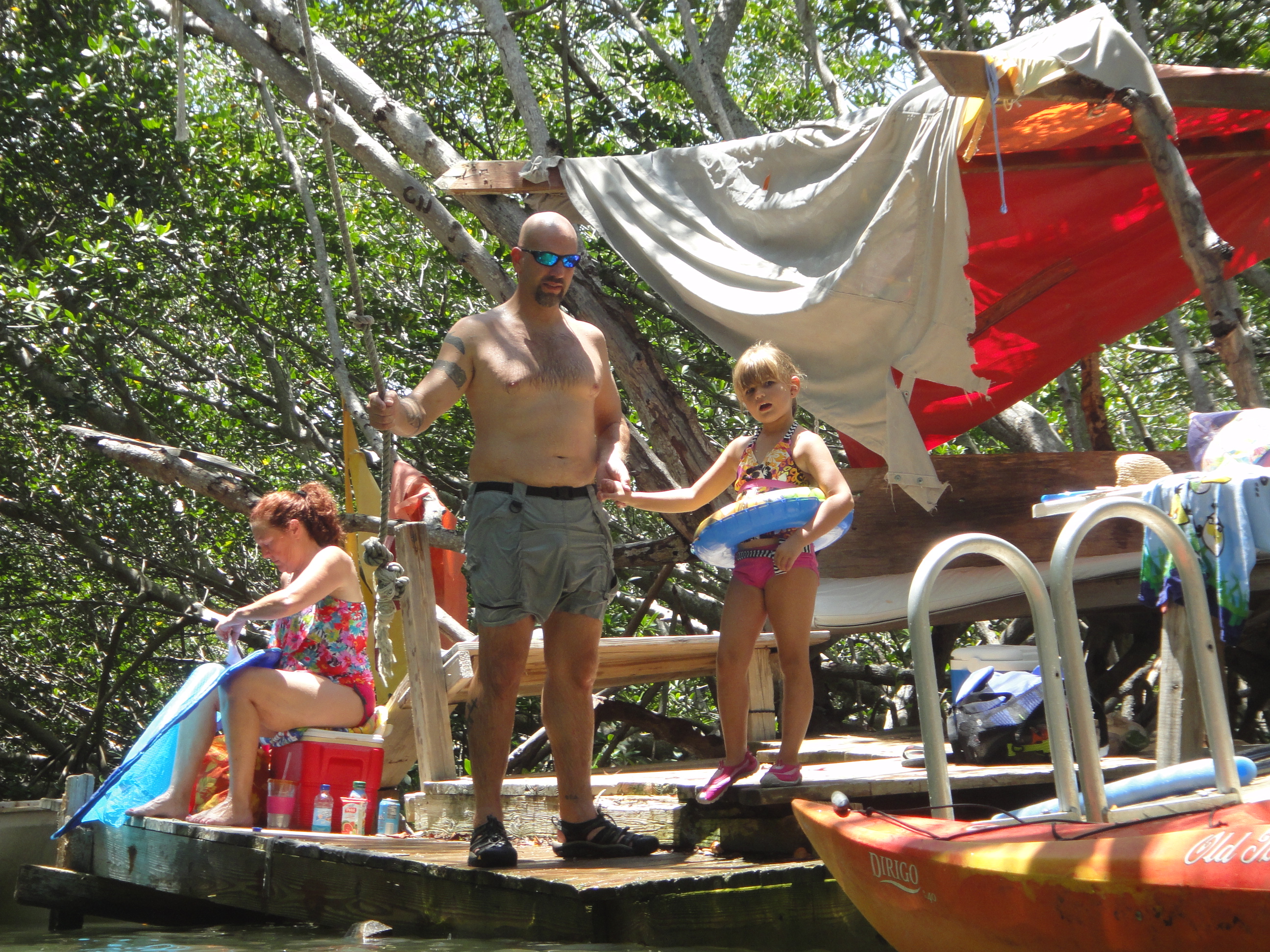 But enough with the memory lane trip – today we did something totally local and unique. My friend Sheryl lives in Islamorada and begs me to come down and visit more often. Last year she stayed with us in Key West and took us on a live-like-a-local-tour of the houses where she grew up in that city, complete with showing her name etched in the concrete sidewalks. Today she took us to a local hangout inside a stand of mangroves (also known as a mangal — I’m full of useless trivia today!) We put our kayaks with the kids in behind an abandoned house in in Tavernier (“don’t worry, everyone knows its been empty for years”), parked in another empty lot (“I’ll call my sister and let her know, she knows the guy”) and only had to paddle about 500 yards out. Sheryl came over with her dinghy with a trolling motor.