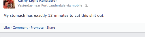 45 minutes later the alarm went off — and I trotted back to the loo. NOT. HAPPY. At 4:48 a.m. I update my Facebook status: